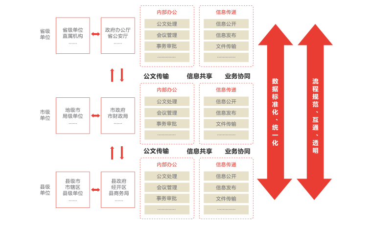 實(shí)現(xiàn)省市縣三級(jí)跨地域、跨層級(jí)、跨單位、跨系統(tǒng)互聯(lián)互通,多級(jí)使用,可統(tǒng)一管理亦可分級(jí)管理。