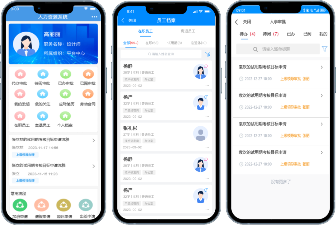 員工關(guān)系變動(dòng)的全流程把控:員工入離職、試用期考核、轉(zhuǎn)正評(píng)估、員工異動(dòng)、工作移交等變動(dòng),通過(guò)流程引擎,保證線上全執(zhí)行、過(guò)程全記錄。