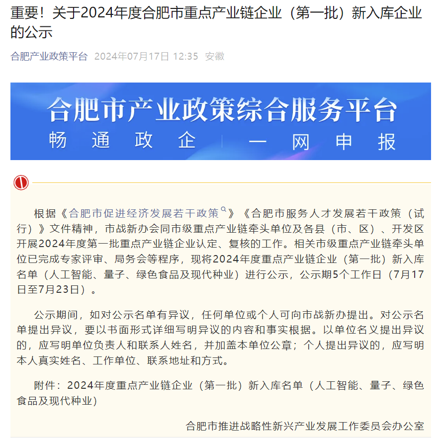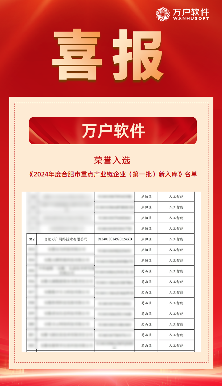 近日,合肥市推進戰(zhàn)略性新興產(chǎn)業(yè)發(fā)展工作委員會辦公室發(fā)布《2024年度重點產(chǎn)業(yè)鏈企業(yè)(第一批)新入庫名單》,萬戶軟件憑借在人工智能領(lǐng)域的突出成果,成功入選該名單。