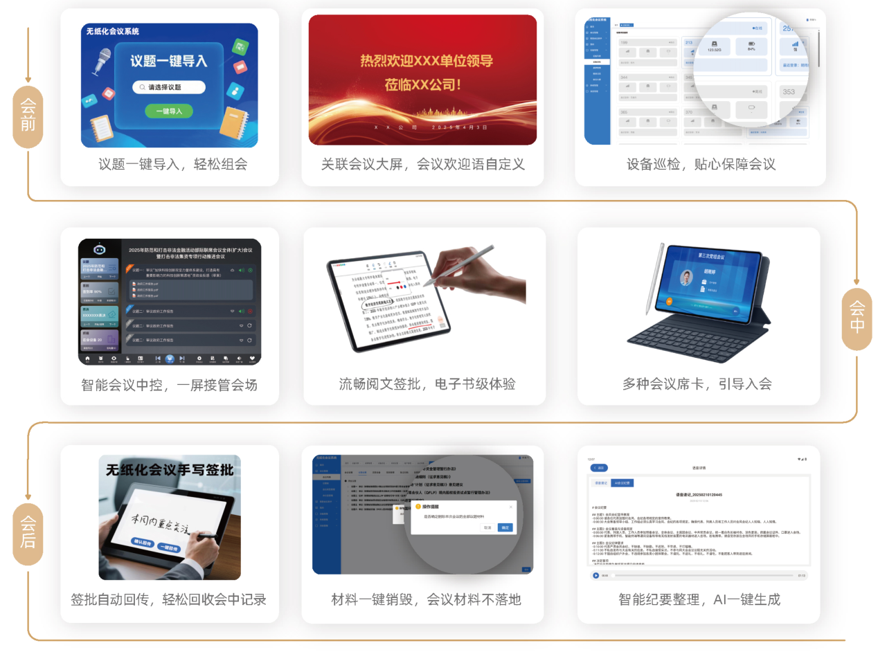 從議題征集、輔助議題智寫上報(bào)、上傳材料智核,到一鍵快捷組會(huì),全方位提升組會(huì)效率;從會(huì)議室預(yù)約、會(huì)議席卡預(yù)設(shè),會(huì)議大屏關(guān)聯(lián),會(huì)議終端巡檢,便捷調(diào)用會(huì)議資源,做好會(huì)議準(zhǔn)備。